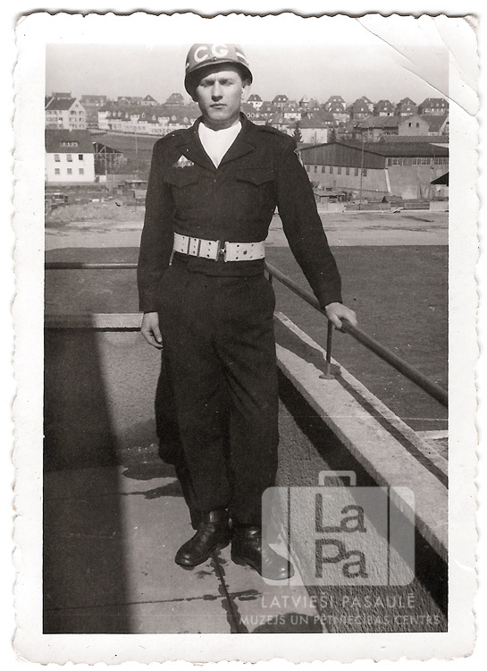 Arnolds Zone stāv uz verandas "melno vienības" uniformā Štutgartē (amerikāņu zonā) ap 1948. gadu. Tālumā redzams pilsētas jumtu skats.