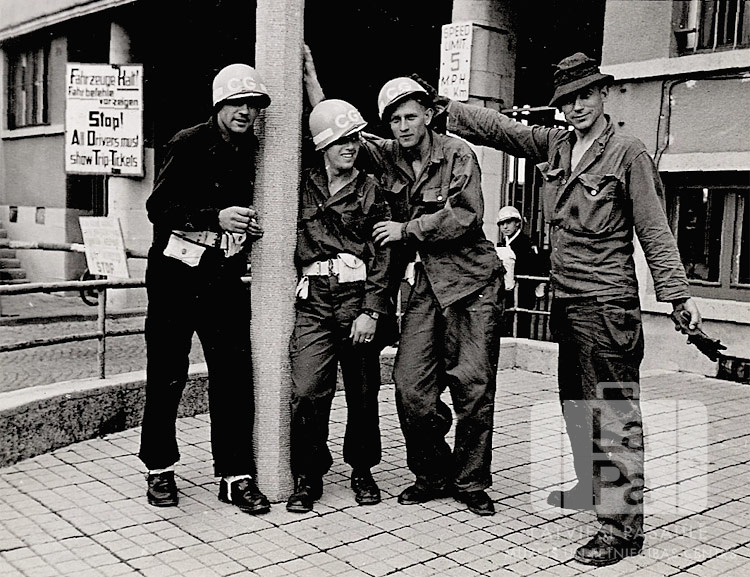 Četri vīri pie staba Štutgartē (amerikāņu zonā) blakus kontrolpunktam ap 1948. gadu. Aiz viņiem kreisajā pusē redzams uzraksts vācu un angļu valodā. Angliski rakstīts: "Stop! All Drivers must show Trip Tickets". No kreisās: Gunārs Zariņš, Jānis Ûdris, Arnolds Zone un nezināms.