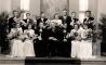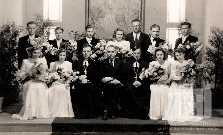Iesvētības Valkas nometnē Nirnbergā (amerikāņu zonā). Kleitās un uzvalkos tērpti tērpti jaunieši ar mācītājiem tērpos pirmās rindas vidū. Iesvētāmajiem rokās ziedi.
