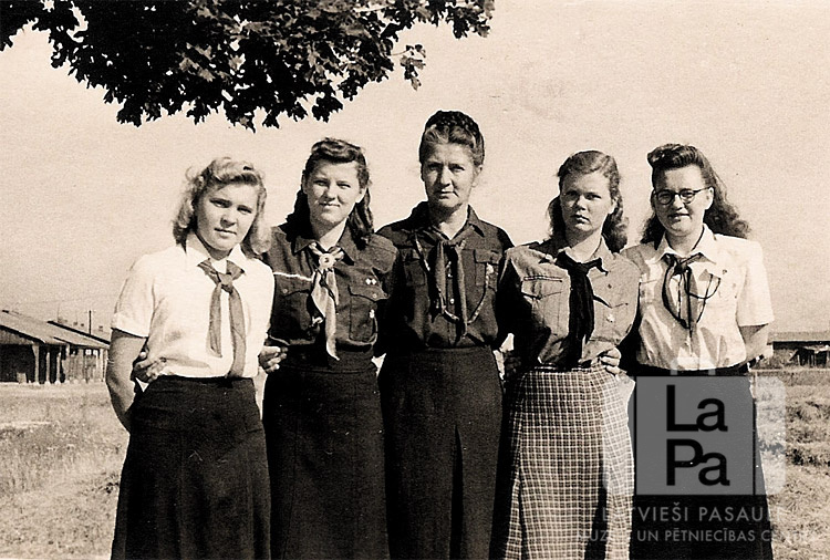 Piecas meitenes gaidu uniformās Nirnbergā (amerikāņu zonā). Kreisajā pusē aiz meitenēm zemu noliecies koka zars. Tālumā redzamas vienstāvu koka ēkas. Pirmā no kreisās: Rasma Bērziņš.