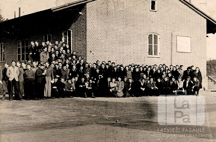 Ģimnāzijas audzēkņi pie ēkas Fišbahas nometnē (amerikāņu zonā). Par šo gadījumu Arnolds Zone atceras: "Ēka aiz audzēkņiem saucās "melnā bumba"; zāle, kurā varēja dejot."