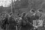 Sidrabenes 33. skautu vienības vadītājas Altgargē (angļu zonā) sasveicinās ar Pērses 5. skautu vienības ciemiņiem no Saules nometnes Gēsthahtā. Foto autors: ? Neboiss.