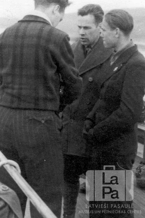 Vadītāji Saules nometnē Gēsthahtā (angļu zonā) pārrunā Pērses 5. skautu vienības ekskursiju uz Altgarges nometni, lai viesotos pie Sidrabenes skautiem. No kreisās: Artūrs Neboiss, vadītājs Mārtiņš Vētra, Edvīns Nātre. Foto autors: ? Neboiss.