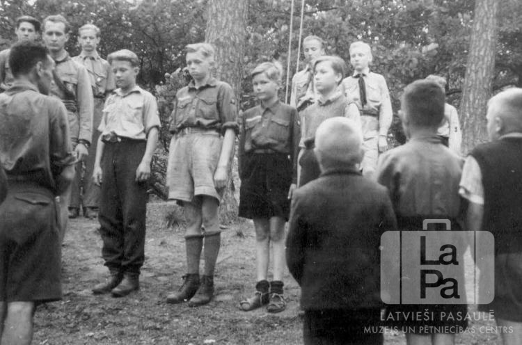 Fotogrāfijas dāvinātāja rakstītais atmiņu stāsts par bēgļu gaitām un bēgļu nometnēm: "Daudzu skautu un skautu vadītāju dīpīšu gaitas un stāsti nav zināmi, bet visus viņus pulcināja un vadīja vadītāja V. Klētnieka raksts. "Pašu spēkiem" (no grāmatas "Latviešu Skautisma Četrdesmit Gadi”) Tikko kaŗa vētras norima un izkaisītie latvieši paspēja sazināties vai pulcēties pārvietoto (DP) personu nometnēs, vienā pēc otras tur sāka dibināties skautu vienības. Tas notika gluži bez kāda pamudinājuma no ārienes – skautu vadītāji un bijušie skauti, redzēdami zēnus bez nodarbības, sāka ar tiem iet skautu rotaļās un vingrinājumos, degt ugunskurus un radināties skautu tikumos. Tikai vēlāk šo trimdas skautu vienību vadītāji sazinājās, un apvienojas kopēja virsvadība. Tad arī pašpārvaldes iestādes atzina skautisma derīgumu un to atbalstīja. Savu atbalstu neliedza arī cittautu skautu brāļi un apgādes organizācijas. Tā 1945. gada vasarā latvieši sāka skautot Rietumvācijā, rudenī arī Zviedrijā un Dānijā, pat aiz gūsta dzeloņstiepļu žogiem Beļģijā; drīz sekoja Austrija. Gandrīz no nekā radās sava skautu literatūra, notika konferences un kursi, latviešu skauti varēja tērpties skautu tērpos, iekārtot savas latviskas mītnes un iet nometnēs un sirojumos. Latviešu skautisms izrādījās par stipru ziemcieti, kas bija nevien brangi pārziemojis bargajā okupācijas un kaŗu ziemā, bet tūliņ necerēti sazēla un uzplauka. Tā trimdā skautisms latviešu jaunatnei kļuva vel pazīstamāks kā dzimtenē, jo nebija neviena, kas to noēnotu. Latviska gara caurstrāvots, viņš radināja trimdas jaunatni skautu likumos un latviskos tikumos, lai tā nenoklīstu svešuma neceļos un neaizmirstu ceļu atpakaļ uz dzimteni. Iedams trimdas citzemju skautu pulkā, viņš arī tur pauda latviešu gara diženumu un saderības tikumu.""