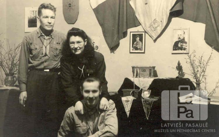 Trīs cilvēki skautu formās. Uz sienas skautu karogi un bildes