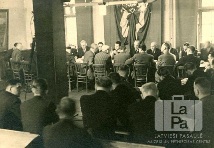Latvijas Centrālās padomes 2. sesija Hānavā (amerikāņu zonā). Pie galdiem sēž vīriešu grupa; aiz viņiem uz sienas Latvijas valsts karogs. Galda otrā pusē redzami: Eduards Grozbergs, vicepriekšsēdis Jānis Lavenieks, priekšsēdis Alfrēds Valdmanis, sekretārs Andrejs Punka un Jānis Goldmanis.
