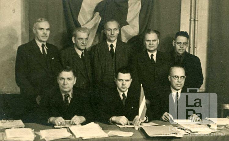 Latviešu Centrālās padomes locekļi 2. sesijas laikā Hānavā (amerikāņu zonā). Aiz viņiem uz sienas Latvijas valsts karogs. Pirmā rindā, no kreisās: LCP prezidijs – Jānis Lavenieks, Alfrēds Valdmanis un Andrejs Punka. Otrā rindā, no kreisās: Latviešu Centrālā komiteja – Eduards Grosbergs, Arveds Švābe, Kārlis Kundziņš, Fricis Gulbis un Jānis Celms.