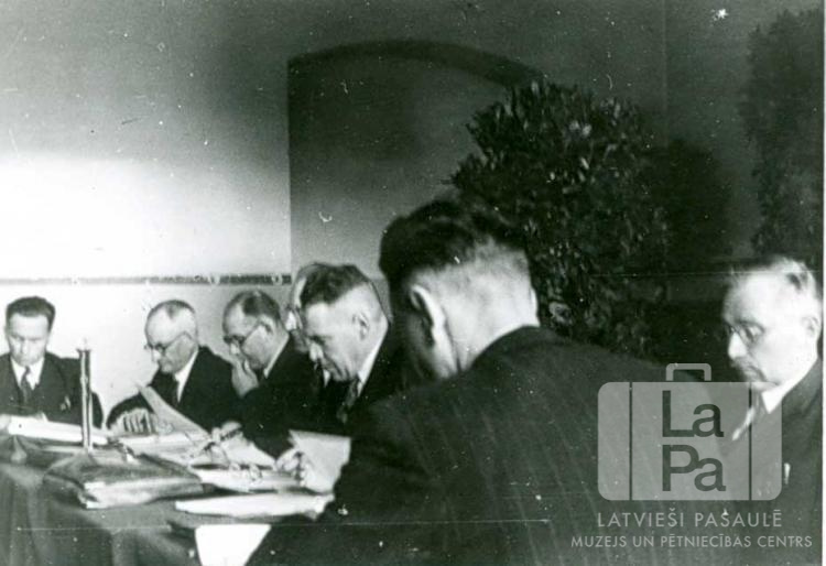 Latviešu Nacionālās padomes prezidijs un valde sēdes laikā Vircburgā (amerikāņu zonā) 1948.–1949. gadā. LNP prezidijs un valde. No kreisās: Ludvigs Bērziņš, Roberts Liepiņš, Vilis Hazners, nezināms, Jānis Celms, Vilis Janums (no muguras) un Arnolds Endziņš. Par šo gadījumu Arturs Neparts atceras: "1948. gada aprīlī Vircburgā Latvijas Centrālās padomes (Latvijas CP), Latviešu Centrālās padomes (LCP), Latvijas Sarkanā krusta (LSK), Latviešu Studentu centrālās apvienības (LSCS), Daugavas Vanagu (DV), Latviešu Organizāciju apvienības (LOA) un Latviešu pretestības kustības dalībnieku apvienības (LPKDA) pārstāvji vienojās nodibināt jaunu – galvenokārt no organizācijām – globālo pārstāvības organizāciju LNP (Latviešu Nacionālā padome). LNP mērķis bija politiski Latvijas atbrīvošana, tautas saglabāšana un sadarbība."