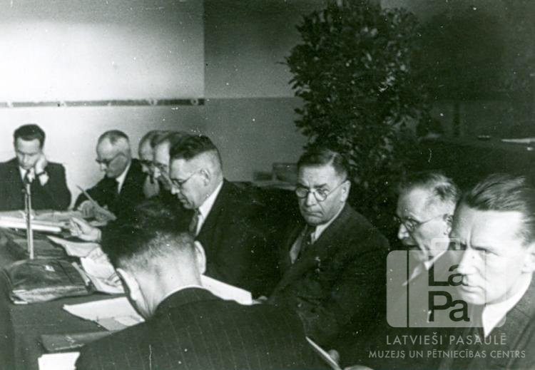 Latviešu Nacionālās padomes valdes sēde Vircburgā (amerikāņu zonā) 1948.–1949. gadā. No kreisās: Ludvigs Bērziņš, Roberts Liepiņš, Vilis Hazners, nezināms, Jānis Celms, Jānis Lavenieks, Arnolds Endziņš un Voldemārs Lambergs. Priekšplānā: Vilis Janums (no muguras).