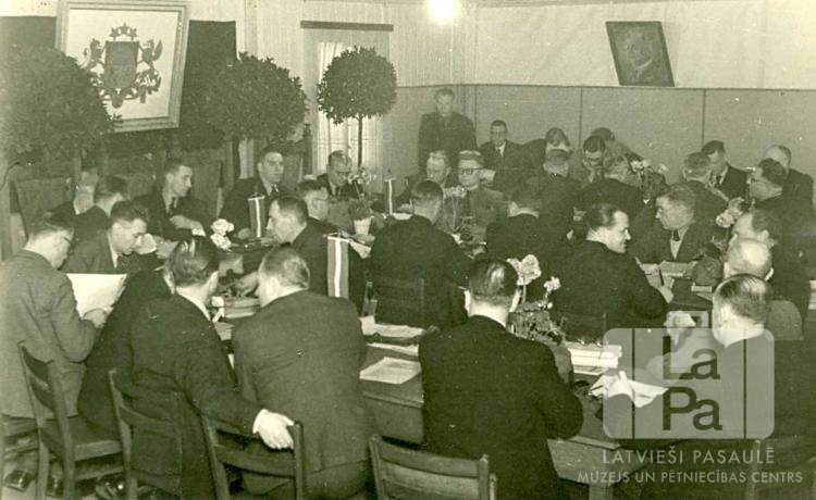 Latviešu Nacionālās padomes sēde Eslingenē (amerikāņu zonā) 1948.–1949. gadā. Cilvēki pie galdiem ar Latvijas karodziņiem. Pie sienas Latvijas valsts ģerbonis. Zem ģerboņa sēž LNP prezidijs; otrais no labās priekšsēdis Jānis Celms. Aizmugurē stūrī stāv sekretariāta vadītājs Arturs Neparts, viņam priekšā Latviešu Centrālās komitejas (LCK) kancelejas priekšnieks Jānis Niedra. Foto autors: K. Puriņš.