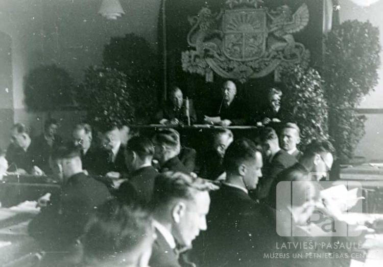 Latviešu Nacionālās padomes sēde Eslingenē (amerikāņu zonā). Aizmugurē uz paaugstinājuma trīs vīrieši sēž; aiz viņiem uz sienas Latvijas ģerbonis. Pārējie sēž pie galdiem priekšā.