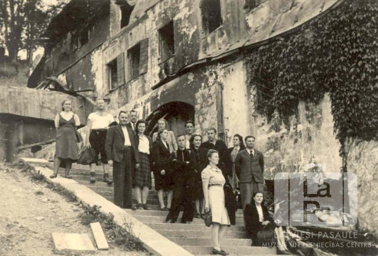 Latvieši no Hānavas nometnes (amerikāņu zonā) ekskursijā stāv uz kāpnēm pie bijušās Ādolfa Hitlera mājas Berhtesgādenā. Blakus sabombardēta celtne.