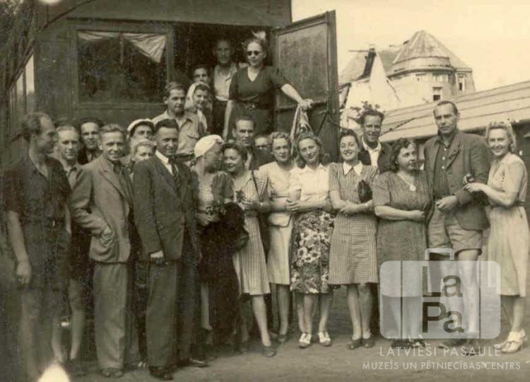 Hānavas nometnes (amerikāņu zonā) latviešu organizētāji ar Mērbekas aktieriem. Aizmugurē redzamas vairākas ēkas. Mērbekas nometnes teātris ieradies ciemos ar izrādi "Divpadsmitā nakts”. Pirmajā rindā aktieri, no kreisās: otrais Osvalds Ûršteins, desmitais Pēteris Dumpis un vienpadsmitā Hilda Prince-Ûršteina. Attēlā redzami arī L. Bērziņš, ? Skujiņa un ? Cirīša.