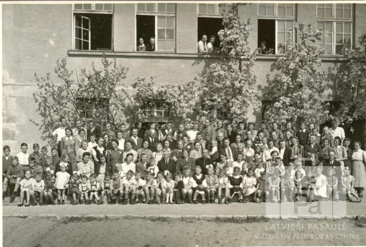 Iemītnieki “La Guardia" nometnē Rotenburgā (amerikāņu zonā) 1947. gada vasarā pie ēkas logiem. Arī ēkas logos redzami cilvēki. Pirmajā rindā, pirmie no kreisās: Rūta Krinte, nezināms, Irēna Meirāns, Lilita Meirāns, Biruta Meirāns, Māris Silarājs, Ojārs Silarājs, Juris Martinskis, ? Ruduss, nezināms, Viesturs Felkers, Uldis Felkers. Pirmajā rindā, pirmie no labās: pirmā Māra Dāvis, otrais ? Klauss.Otrajā rindā, no kreisās: nezināms, Juris Krinte, Ansis Ābele, Ludmila Meirāns, Elza Silarājs, Milda Martinskis, ? Ruduss ar dēlu, Klauss Velta ar dēlu Uldi, Juris Stūris (nometnes komandants), ? Karolina (nometnes direktrise), Leonīds Zeps, nezināms, ? Jaunkalšnieks, Berta Sakārnis, nezināms, nezināms, nezināms, nezināms, ? Selga. Trešajā rindā, no kreisās: pirmais Juris Dāvis, sestais Ansis Ābele, devītais ? Zeps, desmitais ? Bergmanis, vienpadsmitais ? Felkers, divpadsmitais ? Gailis ar meitu, četrpadsmitais ? Selga, sešpadsmitais ? Jaunkalšnieks. Trešajā rindā, pirmie no labās: Ilza Lūsis, Marta Bučiska, ? Šmits, Vilmas Tomsons, Rūdolfs Ābele, Marta Ābele. Ceturtajā rindā redzami: ? Ozols, Anna Ivāns, Ausma Kaziņš, ? Kaziņš, ? Bučiska, Ernests Felkers, ? Volbergs, ? Volbergs, ? Gensbīgels, Zelma Drande ar meitu, Kārlis Drande, ? Lapše ? Gailis. Piektajā rindā, pirmie no kreisās: pirmais Žanis Krinte, otrais Kārlis Ivāns, trešais Arnolds Kaziņš, devītais ? Gensbīgels, divpadsmitais ? Mudis, trīspadsmitā Mirdza Zandbergs, četrpadsmitais ? Miezītis, piecpadsmitā Rūta ?, sešpadsmitais ? Gensbīgels. Piektajā rindā, pirmā no labās: Helēna Dāvis (nometnes saimniece). Aizmugurē ēkas logos redzami, no kreisās: Marija Bundulis, Edgars Kops, Voldemārs un Helēna Saulēvičs ar dēlu Linardu, Alise Krinte.