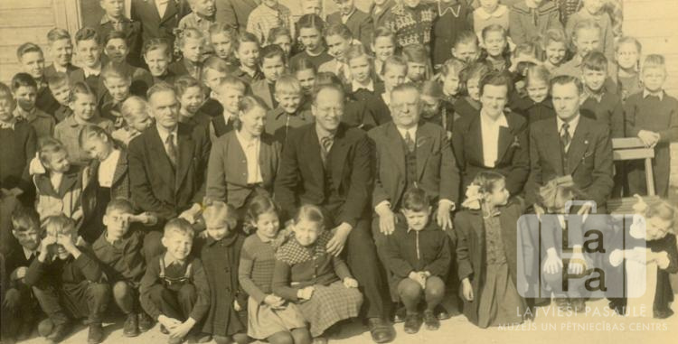 Bērni un skolotāju kopbilde, bērni stāv rindās aiz skolotājiem, kuri sēž priekšā uz krēsliem. Daži bērni tup viņiem priekšā.