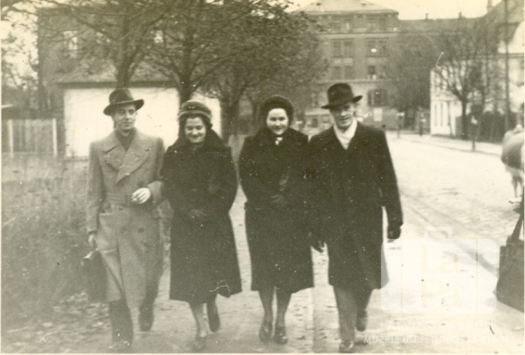 “Hindenburga kazarmu” nometnes iemītnieki dodas no dzimtsarakstu nodaļas uz nometni Ansbahā (amerikāņu zonā). No kreisās: Žanis Krinte, Milda Martinskis, Elza Mačs (dz. Silarājs) un Arvīds Mačs.