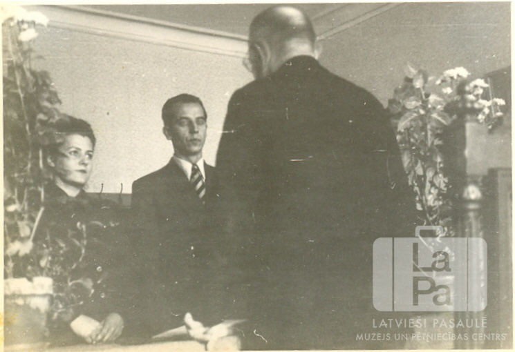 Jaunlaulāto sarakstīšanās Ansbahas vācu dzimtsarakstu nodaļā (amerikāņu zonā). No kreisās: Milda Martinskis, Žanis Krinte, nezināms. Par šo gadījumu Arvīds Mačs atceras: "Liecinieki bija Elza un Arvīds Mačs. Ansbahas “Hindenburga kazarmes” nometnes iedzīvotāji."