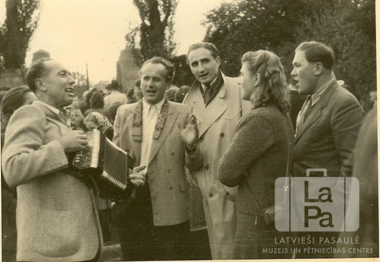 Ansbahas “Hindenburga kazarmes” (amerikāņu zonā) iemītnieki tiek pārvietoti. Priekšplānā dziedoši cilvēki, vienam rokās akordeons. Aizmugurē cilvēku pūlis un tālumā pavērti vārti. Priekšplānā, no kreisās: Arturs Julla (ar akordeonu), ? Vaikevics, Arturs Smilga, ? Vaikevics, nezināms. Foto autors: Arvīds Mačs. Par šo gadījumu Arvīds Mačs atceras: “Atvadīšanās no Ansbahas ar dziesmu.”