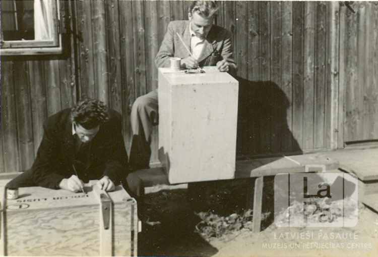 Divi vīrieši barakas priekšā ar otām krāso burtus adresēm uz lielām bagāžas kastēm Ambergā (amerikāņu zonā) 1950. gada vasarā. No kreisās: Arvīds Mačs un Kārlis Ivans. Foto autors: Elza Mačs (dz. Silarājs).