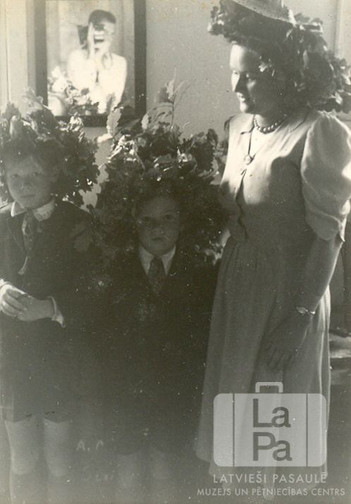 Sieviete ar diviem zēniem Jāņu svētkos Šleisheimā (amerikāņu zonā) 1951. gada vasarā. Visiem galvās ozollapu vainagi. Aizmugurē pie sienas spogulis, kurā redzams fotogrāfs. No kreisās: Ojārs Silarājs, Māris Silarājs, Elza Mačs (dz. Silarājs). Foto autors: Arvīds Mačs.