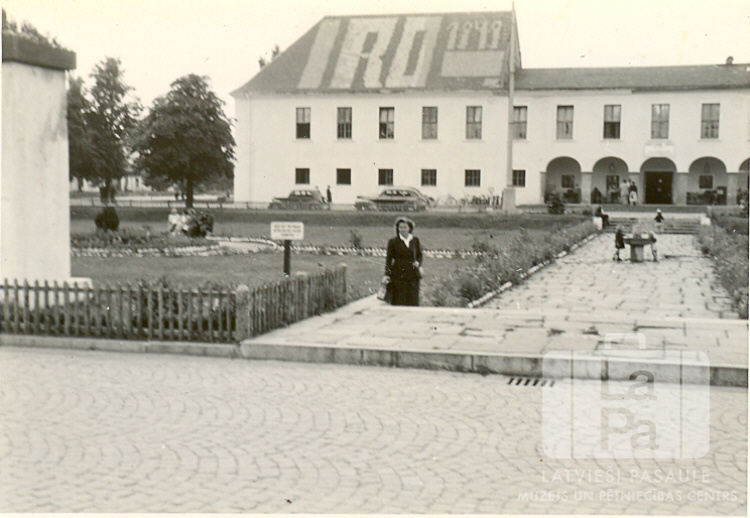 IRO ("International Refugee Organization") galvenā mītne Minhenē (amerikāņu zonā) 1951. gada augustā. Uz ēkas jumta ar gaišu krāsu uzkrāsoti burti "IRO". Uz kāpnēm redzama stāvam Elza Mačs (dz. Silarājs). Foto autors: Arvīds Mačs.