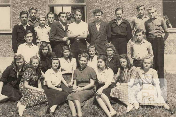 Latviešu apvienotās ģimnāzijas 2. klase sēž zālē Neištates nometnē (Holšteinā, angļu zonā) 1949. gada vasarā (1949.–1950. mācību gadā). Aiz ģimnāzistiem fonā ir ēka. Ēkas durvīs nezināmi cilvēki.