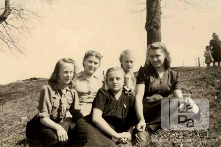 Ventas 4. gaidu vienības kops sanāksmē brīvā dabā Iceho nometnes tuvumā (angļu zonā). No kreisās: ? Cīrule, Ināra Endziņa, Inta Graudiņa, Maija Migle un ? Stronga.