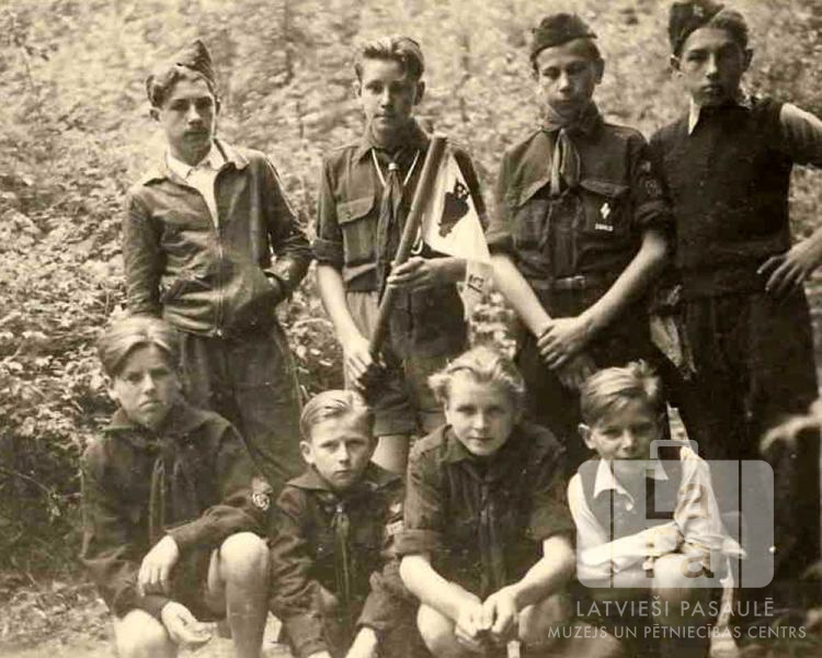Ventas 13. skautu vienības skautu kops formastērpos Iceho nometnē (angļu zonā). No kreisās: Priekšā, no kreisās: Alfrēds Strauts, Laimonis Pētersons, Arturs Blauzda un ? Bikavnieks. Aizmugurē, no kreisās: Mario Bermanis, Zigurds Kaņepe, ? Cīrulis un Udo Bermanis.