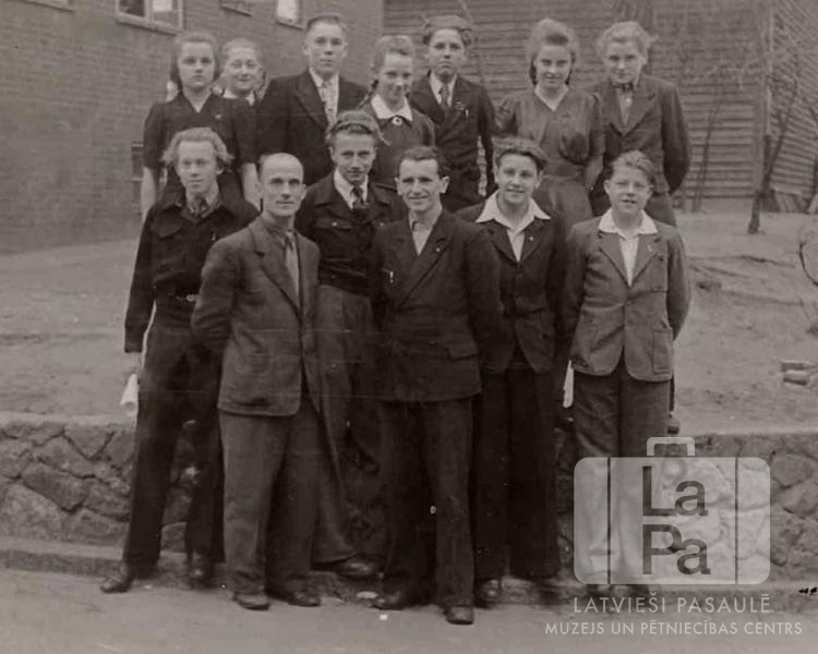 Pamatskolas absolventi ar skolotājiem Iceho nometnē (angļu zonā) 1948. gada pavasarī. Pirmajā rindā, no kreisās: Edvīns Linkēvics, skolas pārzinis Andrejs Ozoliņš, Alfrēds Rolle, klases audzinātājs Alberts Zids, Zigurds Kaņepe un Teodors Galvins. Otrajā rindā, no kreisās: Inta Graudiņa, Arvīds Rolle, Gunārs Ozoliņš, Ranta Tone, Alfrēds Strauts, Irēna Venclavovica un Artūrs Blauzda.