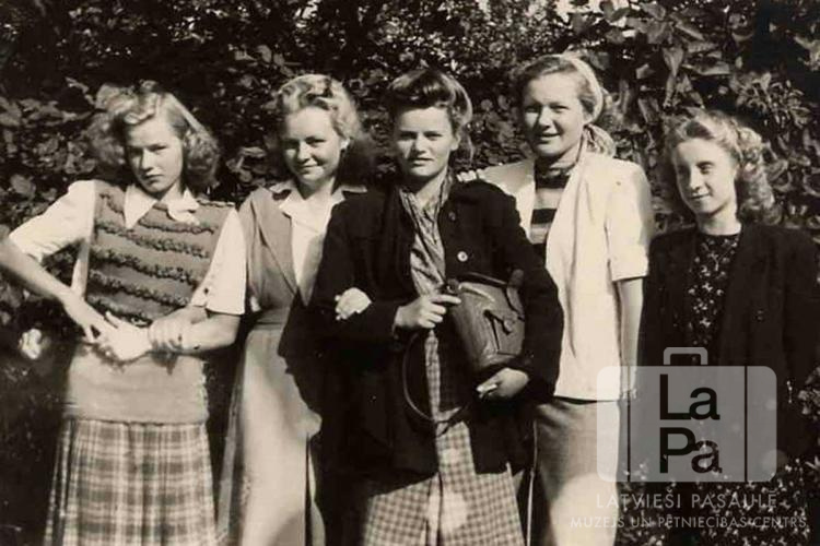 Latviešu meiteņu grupa no apvienotās dīpīšu ģimnāzijas Neištatē (Holšteinā, angļu zonā). No kreisās: Jolanta Sproģe, nezināms, nezināms, Irīna Freimane un Lilija Kārkliņa.