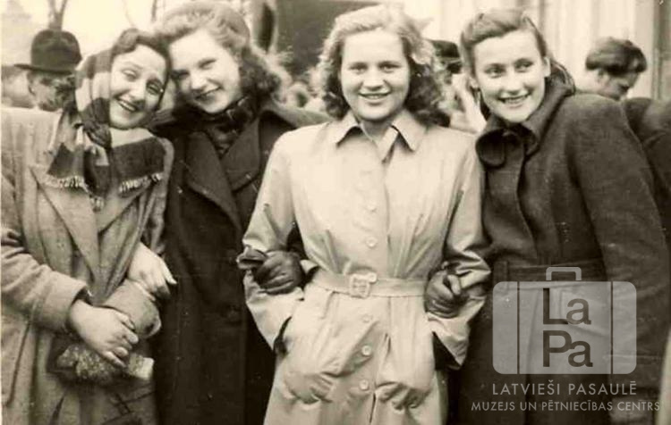 Četras ģimnāzistes Neištatē (Holšteinā, angļu zonā). Visām mēteļi mugurā, citām šalles, citām cimdi. Aizmugurē cilvēku pūlis. Otrā no kreisās: Pegija Skrastiņa.