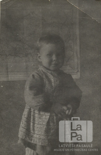 Fotogrāfijas dāvinātāja rakstītais atmiņu stāsts par bēgļu gaitām un bēgļu nometnēm: "Izceļoja tēvs Artūrs Pētersons, māte Lidija Pētersone (dz. Bokums) ar meitām Astru (pr. Zemzars) un Māru (pr. Beldavs) no Liepājas. Arturs Pētersons – atmiņas: 1944. gada 24. oktobris, tāpat kā iepriekšējās dienas, ikvienam latvietim bija skumja un drūma, domājot par savu un savas nelaimīgās dzimtenes nākotni, kad ik dienas bija dzirdama lielgabalu dunoņa no tuvās frontes un bieži bija jāpārdzīvo padomju lidmašīnu uzbrukumi Liepājā, kas tajā laikā bija kļuvusi ne tikai par vācu okupācijas varas, bet arī par latviešu bēgļu pulcināšanas un evakuācijas centru. Kā frontes tuvuma dēļ, tā arī ar vācu okupācijas varas aizliegumu palikt dzīvot Liepājā, pa lielai daļai latviešu bēgļi no Padomju Savienības karaspēka okupētajiem Latvijas apgabaliem tajā laikā atstāja Liepāju, izbraucot pa vācu okupācijas varas atļauto un norādīto ceļu – uz Vāciju, lai gan paši bēgļi labāk izvēlētos ceļu pāri Baltijas jūrai uz Zviedriju. Lai nedotu latviešu bēgļu straumei iespēju izmantot šo ceļu, bet novirzītu to uz Vāciju, kur tie nebija domāti cilvēcīgai palīdzībai, bet gan kā darbaspēks, vācu okupācijas vara bija noorganizējusi ļoti stingru Kurzemes piekrastes apsardzi. Tāpēc tikai nedaudziem izdevās pārvarēt šo apsargāto joslu un nokļūt Zviedrijā. Daži šajā ceļā zaudēja ne tikai savu pēdējo mantu, bet arī brīvību un nokļuva vācu okupācijas varas cietumos, vai tika izsūtīti uz koncentrācijas nometnēm Vācijā. Kaut gan 24. oktobra dienas rudenīgi saulainās debesis, kurās lēni peldēja retas mākoņu laivas, pauda rudens mieru un svētību, daudziem šī diena bija viena no skumjākajām dzīvē, jo bija jāatstāj dzimtene – jāpošas tālā un svešā ceļā. Šīs dienas ceļinieku vidū biju arī es ar ģimeni (sievu un diviem maziem bērniem, no kuriem jaunākais bija tikai vienu mēnesi vecs), Sociālā departamenta darbinieki ar direktoru St. Jaundzemu, Liepājas zīdaiņu nama un zēnu patversmes bērni ar šo iestāžu vadītājiem, ārstiem Kalniņu un Gūtmani, un darbiniekiem. Visu pēcpusdienu plūda šo ceļinieku straume ar savām mantām dažādos satiksmes līdzekļos uz Liepājas ostu, kur šo nelaimīgo ceļinieku transportam paredzēts Jaunliepājas pusē stāvēja lielais vācu preču-pasažieru kuģis „Lappland”. Ap pulksten 18 padomju lidmašīnu uzbrukumu laikā, eksplodējot ostā un tās apkārtnē šo lidmašīnu mestajām bumbām un dunot vācu pretaviācijas lielgabaliem, "Lappland” atstāja Liepājas ostu, pametot ostmalā neuzņemtus ap 50 latviešu bēgļu divriteņus un citas mantas, kas palika vācu žandarmērijas rīcībā. Kuģim attālinoties no Liepājas un satumstot, latviešu trimdinieku skatiem pamazām izzuda dzimtenes krasti, un šajā brīdī atkal valgas kļuva viņu acis, jo vairāk kā jebkad ikviens tad izjuta dzimtenes vērtību. Tikai senču asiņu balss modināta ticība, ka reiz atkal ausīs dzimtenes brīvības diena, kas atvedīs atkal dzimtenē kara vētru svešās zemēs izkaisītos latviešus, stiprināja trimdiniekus šajā grūtajā un nezināmā ceļā. Mūsu jūra, Baltijas jūra, šajā naktī rāma kā ezers, mirgoja mēness gaismā. Mēs braucām vairāku kuģu karavānā, kuru apsargāja vācu karakuģi. Gaismai austot, mēs tuvojāmies svešās zemes krastiem, kur miglā tīts bija redzams kādas pilsētas siluets. Uzzinājām, ka tā ir Gotenhāvena (poļu Gdiņa). 25. oktobrī ap pulksten 10.00 "Lappland” iebrauca Gotenhāvenas ostā. Uz kuģa ieradās vācu NSV darbinieces, kas reģistrēja trimdinieku personas dokumentus, apzīmogojot tos ar īpašu vācu robežpolicijas zīmogu. Šī diena un nakts visiem bija jāpavada kuģī. Tikai nākošās dienas pēcpusdienā sākās trimdinieku mantu izkraušana no kuģa un iekraušana preču vagonos, pie kam šajā darbā bija norīkoti vācu karaflotes jūrnieki. Pašus trimdiniekus novietoja (atsevišķi bērnu iestāžu bērnus un personālu, un pārējos) pasažieru vilciena neapkurinātos un neapgaismotos vagonos, kur tiem, saspīlētiem tumsā un salā, bija jāpārnakšņo divas naktis, pie kam šajā laikā bija jāiztiek tikai ar līdzi paņemto uzturu, jo vāci pieaugušiem izsniedza tikai nesaldinātu kafiju ar maizi, bet bērniem divi reizes dienā auzu pārslu vai mannā piena putriņu. 28. oktobrī ap pusdienas laiku šis "pasažieru vilciens” uzsāka braucienu mums nezināmā virzienā. Tikai pēc staciju nosaukumiem konstatējām, ka braucam pa Pomerāniju Štetines virzienā. Brauciena laikā uzlabojās arī mūsu uztura apgāde, jo bez maizes, desas un margarīna, ko izsniedza pāris reizes, pieaugušie gandrīz katrā stacijā saņēma ziltu zupu, bet bērni piena putriņas un pienu. Stargardes stacijā trimdiniekiem, kas nepiederēja pie zīdaiņiem, respektīvi bērnu nama personāla, bija jāpārvietojas citā vilcienā, kurš devās Svinemindes virzienā. Šim vilcienam bija piekabināti preču vagoni, kuros atradās visu bēgļu mantas, un tam līdzi brauca četri bērnu nama grupas pārstāvji, lai gala stacijā palīdzētu izšķirot mantas. Līdz Neubrandenburgas stacijai bērnu nama grupas brauciena gala mērķis vēl nebija zināms. Neubrandenburgā šo grupu sadalīja šādos virzienos: zēnus ar vadītāju Gūtmani uz Varnemindi (laikam uz Gralu pie Varnemindes), mazākos bērnus ar St. Jaundzemu uz Gustrovu un zīdaiņus ar ārsti Kalniņu uz Varenu. Attiecīgām grupām līdzi brauca personāls (kas bija jau sakomplektēts Liepājā), ar saviem piederīgiem. Es pievienojos grupai, kas brauca uz Gustrovu. Še nokļuvām 29. oktobra vēlā pēcpusdienā. Visus atbraukušos – kā bērnus, tā pieaugušos – novietoja NSV bērnu namā "Haus Bergfeld”, kas atradās apm. 4 km aiz Gustrovas pie Gustrovas Plau’as šosejas. Tā b