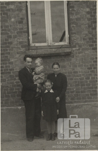 Pētersonu ģimene pie ēkas loga angļu zonā, 1945. gada jūlijs līdz 1946. gada janvāris. No kreisās: Arturs Pētersons, Māra Pētersone, Astra Pētersone (pr. Zemzara), Lidija Pētersone.