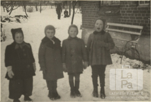 Astra Pētersons ar spēļu biedriem pie nometnes ēkas angļu zonā, 1945. gada jūlijs līdz 1946. gada janvāris. Bērni biezi saģērbušies; apkārt daudz sniega. Pirmā no labās: Astra Pētersone (pr. Zemzara).