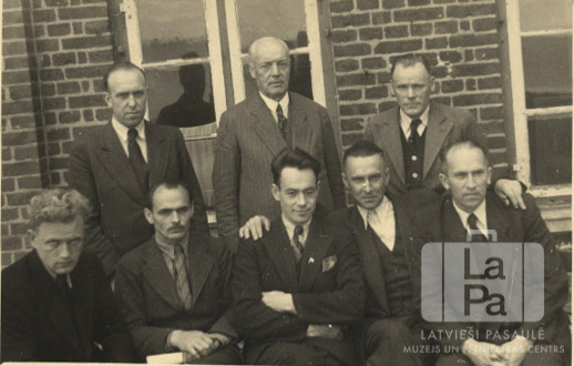 Astoņi vīrieši uzvalkos pie ķieģeļu ēkas logiem – Hafkrugas nometnes vadība (angļu zonā). Pirmajā rindā, trešais no kreisās: Arturs Pētersons.