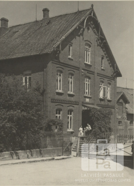 Trīsstāvīga ķieģeļu ēka. Pie ieejas durvīm stāv cilvēki.