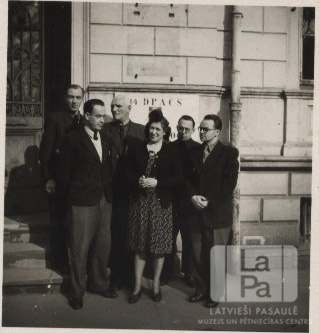 Cilvēku grupa pie ēkas ACCU nometnē Hannoverē (angļu zonā), 27.06.1947.–17.04.1950. Aiz cilvēkiem uz ēkas sienas uzraksts. Redzams burti "DPACS." Pirmajā rindā, pirmais no kreisās: Arturs Pētersons.