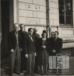 Cilvēku grupa pie ēkas ACCU nometnē Hannoverē (angļu zonā), 27.06.1947.–17.04.1950. Pirmajā rindā, pirmais no kreisās: Arturs Pētersons. Par šo gadījumu Astra Zemzara (dz. Pētersone) atceras: "ACCU nometnē. A.Pētersons strādāja D.P.A.C.S. ["Displaced Persons Assembly Centre”] Hanoverē."