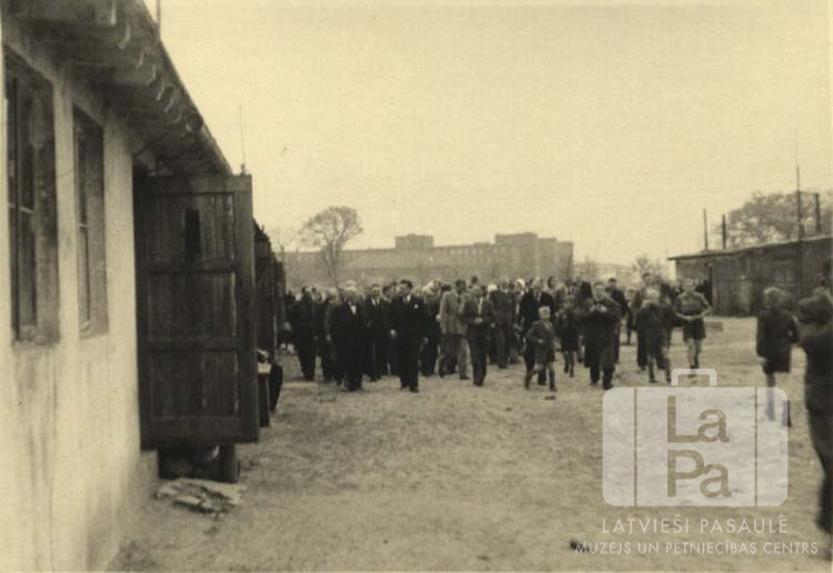 Cilvēku grupa dodas pa laukumu garām vienstāvu barakām oficiālā apskatē ACCU nometnē Hannoverē (angļu zonā), 27.06.1947.–17.04.1950.