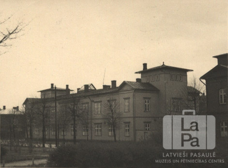 Divstāvīga ēka, priekšplānā koki bez lapām un apstādījumi.