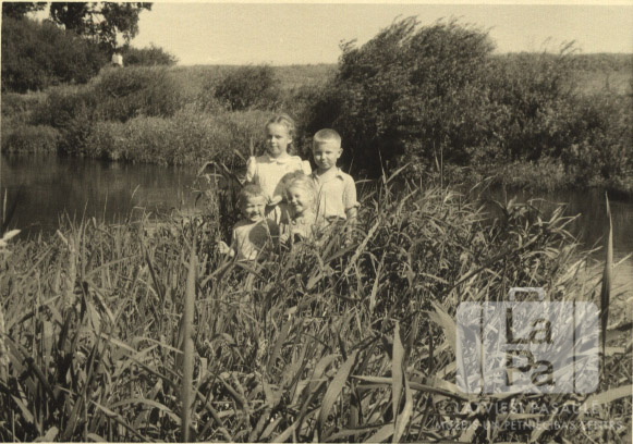 Pētersonu meitas ar kaimiņu bērniem niedrēs pie upes ACCU nometnē Hannoverē (angļu zonā), 27.06.1947.–17.04.1950. Pirmajā rindā, otrā no kreisās: Māra Pētersone. Otrajā rindā, pirmā no kreisās: Astra Pētersone (pr. Zemzara).
