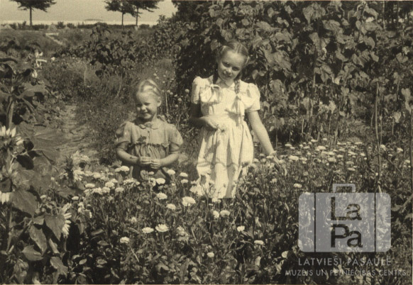 Pētersonu meitas ģimenes dārzā ACCU nometnē Hannoverē (angļu zonā), 27.06.1947.–17.04.1950. Apkārt zied puķes. No kreisās: Māra Pētersone, Astra Pētersone (pr. Zemzara).