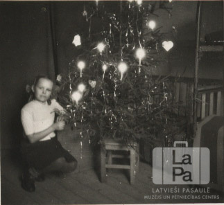 Astra Pētersone (pr. Zemzara) pie izrotātas Ziemassvētku egles ACCU nometnē Hannoverē (angļu zonā), 27.06.1947.–17.04.1950. Pa labi redzama metāla gulta. Par šo gadījumu Astra Zemzara (dz. Pētersone) atceras: "Māte bija bēgļu gaitās paņēmusi līdzi Ziemassvētku rotājumus, tāpēc Pētersonu ģimenei bija krāšņi izrotāta egle (ACCU nometnē)."