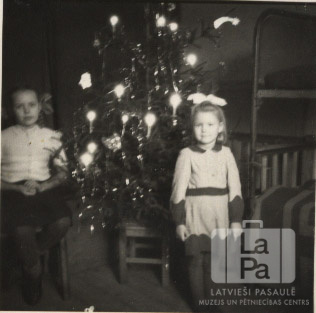 Pētersonu meitas pie izrotātas Ziemassvētku egles ACCU nometnē Hannoverē (angļu zonā), 27.06.1947.–17.04.1950. Pa labi redzama metāla gulta. No kreisās: Astra Pētersone (pr. Zemzara), Māra Pētersone.