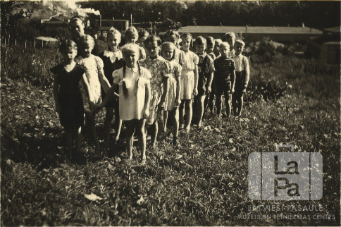 Bērnu grupa dārzā Neištatē (Holšteinā, angļu zonā). Bērni ir sadevušies rokās pa divi un stāv vienā kolonnā. Aiz viņiem kreisajā pusē stāv skolotāja Alma Pētersone Tāmniece. Aizmugurē fonā vairākas ēkas ar kūpošiem skursteņiem.