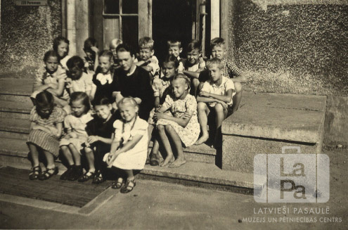 Bērnu grupa sēž uz ēkas trepēm Neištatē (Holšteinā, angļu zonā). Aiz viņiem atvērtas ēkas durvis. Otrajā rindā, ceturtā no kreisās: skolotāja Alma Pētersone Tāmniece (tumšās drēbēs). Par šo gadījumu Astra Zemzara (dz. Pētersone) atceras: "Skolotāja Alma Pētersone Tāmniece, Artura Pētersona māsa, Astras krustmāte, meklējot vīru, atgriezās Latvijā."