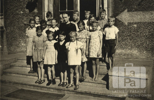 Bērnu grupa stāv uz ēkas trepēm Neištatē (Holšteinā, angļu zonā). Aiz viņiem atvērtas ēkas durvis. Otrajā rindā, ceturtā no kreisās: skolotāja Alma Pētersone Tāmniece (tumšās drēbēs). Par šo gadījumu Astra Zemzara (dz. Pētersone) atceras: "Skolotāja Alma Pētersone Tāmniece, Artura Pētersona māsa, Astras krustmāte, meklējot vīru, atgriezās Latvijā."