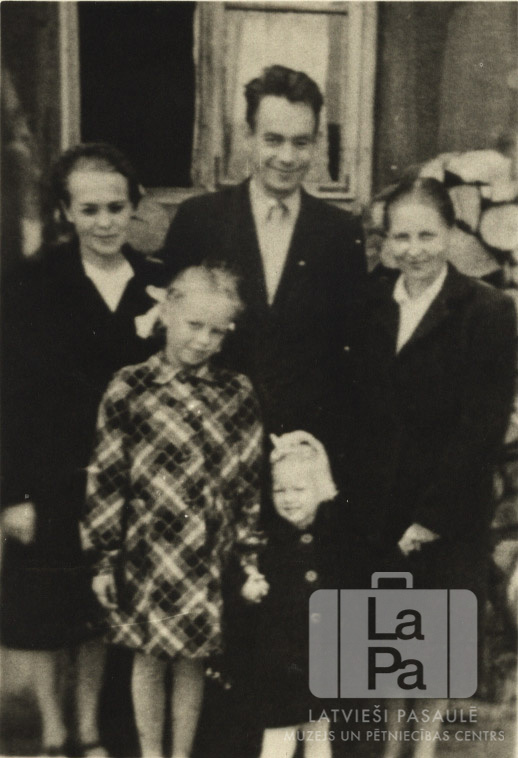 Pētersonu ģimene pie ēkas ACCU nometnē Hannoverē (angļu zonā). Aizmugurē sakrauta, saskaldīta malka un atvērts logs. Priekšā, no kreisās: Astra Pētersone (pr. Zemzara), Māra Pētersone. Aizmugurē, no kreisās: Alma Pētersone Tāmniece, Arturs Pētersons un Lidija Pētersone.