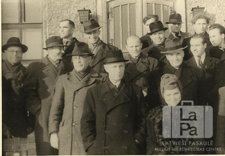 Mācībspēki un jurisprudences studenti Pinnebergas nometnē (angļu zonā) ap 1947. gadu. Attēlā redzami: prof. Kārlis Kļaviņš, lektors Aun, prof. Nurk, prof. ? Stanka, prof. ? Šulcs.