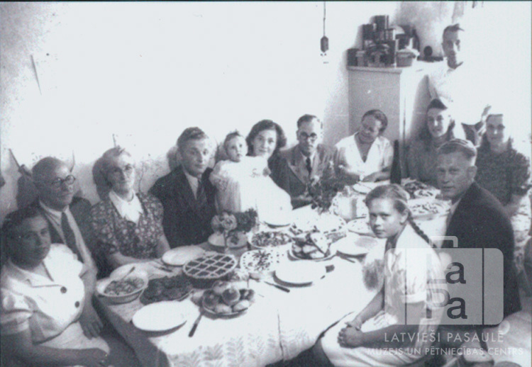 Cilvēku grupa pie ēdieniem klāta galda kristību svinībās Hohfeldes nometnē Augsburgā (amerikāņu zonā). Par šo gadījumu Ausma Wilson (dz. Tuims) atceras: "Kristību svinības nometnē. Mazais bērniņš bija meitenīte Ruta Kupšis."
